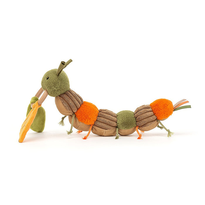 For squiggly garden shenanigans, grab the Christopher Caterpillar Activity Toy! This bobbly bopper has squashy-soft segments in autumn fur and chunky grey cord! Christopher's rocking ribbony tufts, knotty legs, squeaky leaves and a chunky teether!